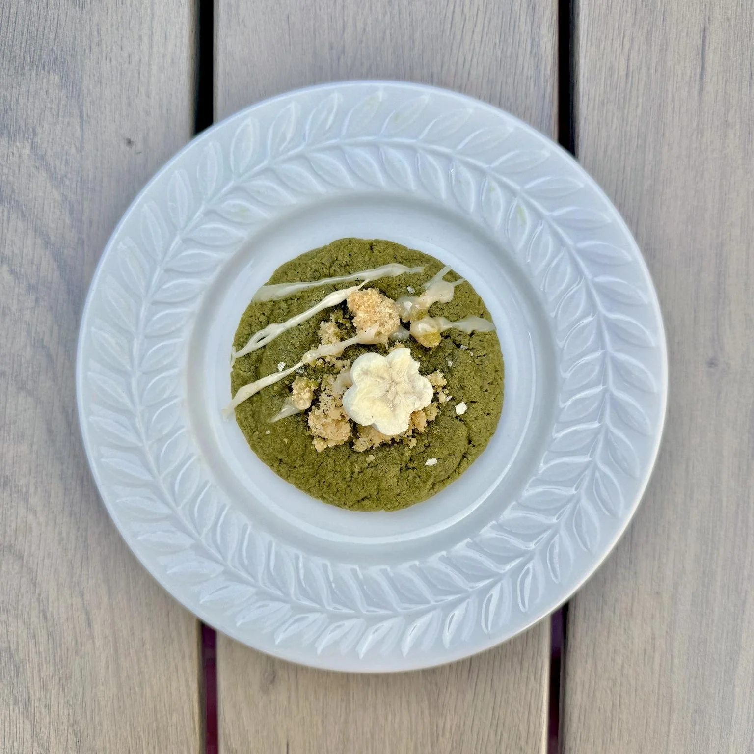 whole wheat flour, homemade vegan butter (avocado oil, coconut oil, soy milk), organic sugar, banana puree, dairy-free white chocolate (cane sugar, palm kernel oil, brown rice syrup, sunflower lecithin), matcha powder, pure vanilla bean paste, salt, baking powder, baking soda.